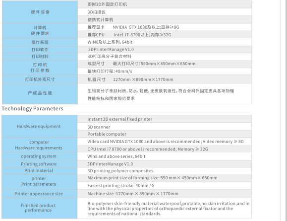 Hardware equipment:Instant3D external flxed printer、3D scanner、Portable computer. Printer appearance size:Machine size:1270mmx890mm x1770mm Finished productperformanceBio-polymerskin-friendly materialwaterpoof,protable,no skin irritation,and inline with the physical properties oforthopaedic external fixator and therequirementsofnational standards.