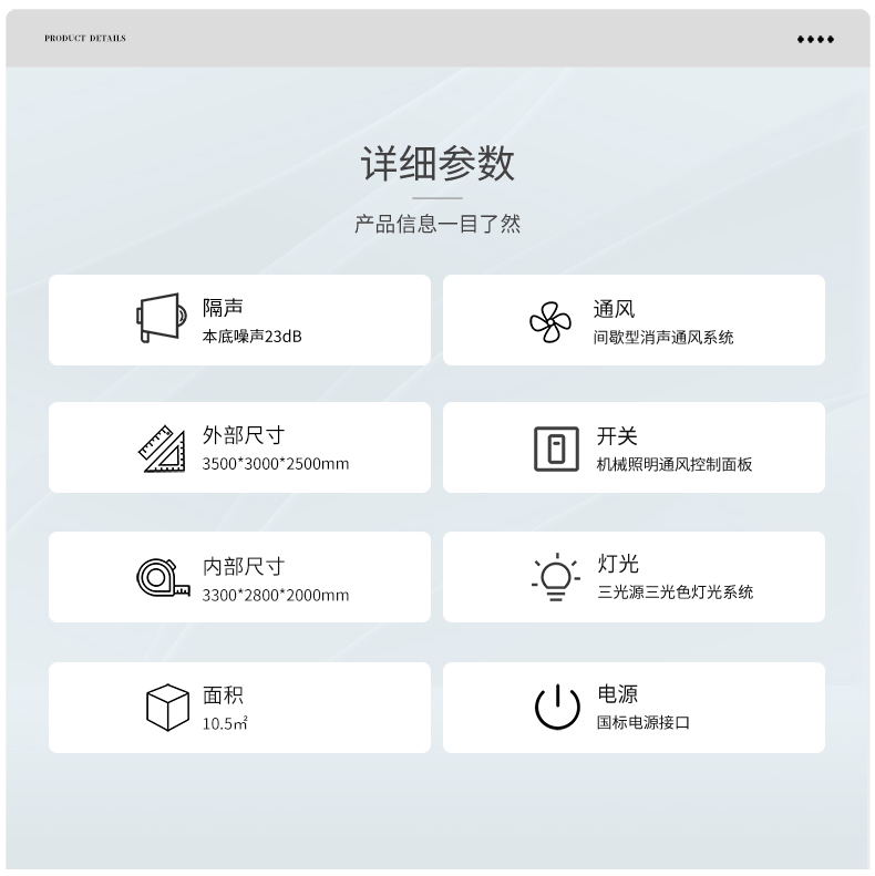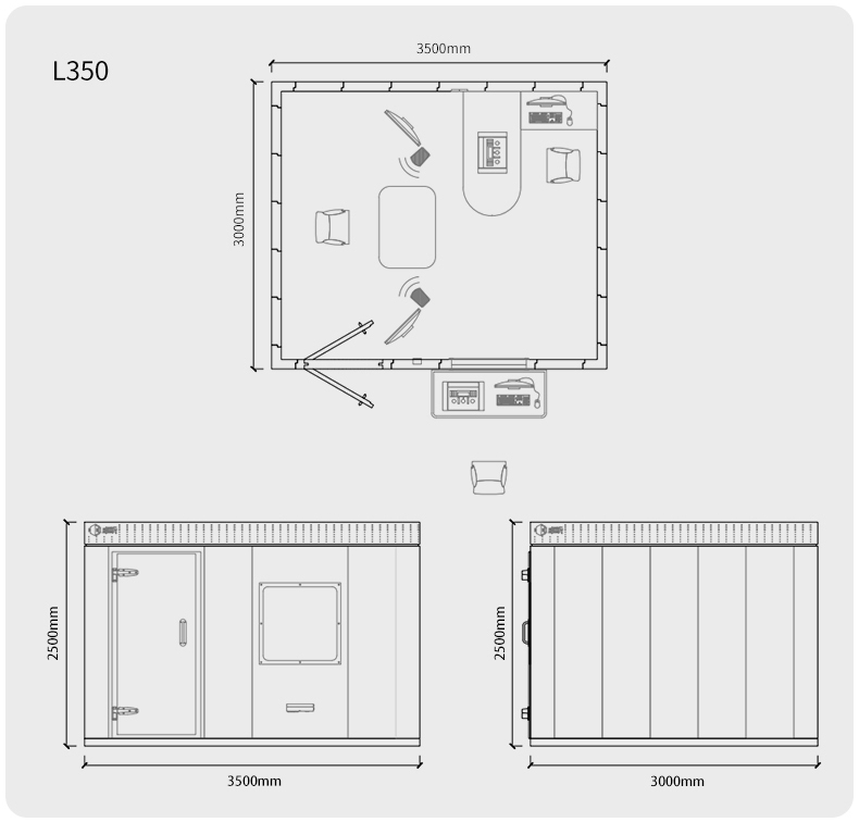 Model:L350 Noise insulation:outdoor ambient noise ≤55dB (A), indoor background noise ≤23dB (A) Environmental protection:Formaldehyde release ≤0.4mg/L,meeting《Indoor decorating and refurbishing materials—Limit of formaldehyde emission of wood-based panels and finishing products》 Reference standard:JJF 1191-2019 《Calibration Specification for Acoustic Performance of Audiometry Rooms》 GB 3096-2022 《Environmental quality standards for noise》 GB 50325-2020 《Standard for indoor environmental pollution control of civil building engineering》 Applications:Pure tone audiometry, speech audiometry, children's auditory speech detection and evaluation, hearing aid fitting, sound field evaluation, speech correction