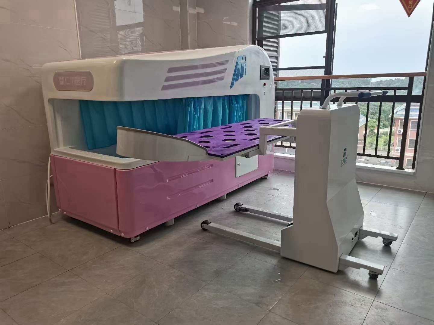 Barrier-free assisted bathing machine features dual functions of cleansing and massage. Utilizing a side-entry design, it offers caregivers convenience while saving space. Its one-touch operation allows simple control with customizable bathing modes, complete with built-in shower gel dispensers. The chamber's water jet massage effectively stimulates metabolism, relaxes tense muscles, enhances blood circulation, reduces stress, eases joint discomfort, and alleviates chronic pain in neck, shoulder, lumbar, and leg areas. Meeting the latest national standards, this device is suitable for hospitals, nursing homes, communities, and households alike.