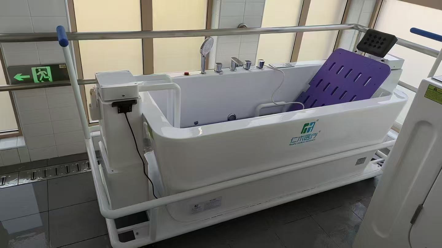 RH-YD-006 Barrier-Free Sliding Bath, featuring 2300×800×1050mm acrylic one-piece molding with zero formaldehyde dead zones, 1700×800×440mm tub with 550L large capacity. The 500mm silent sliding horizontal board allows arbitrary stops, anti-slip multi-hole support for full-body weight-bearing, and direct wheelchair transfer into bath. 12 sets of 120-hole bubble massage with 3rd-level massage + 32-point rainbow LED light therapy, dual water supply via shower and waterfall, 50mm quick drain. Button panel, ozone disinfection <0.01 mg/m³, water-electricity separation with dual leakage protection, 220V/700W low-power design, CE certification, suitable for disabled individuals, postoperative patients, and rehabilitation centers.