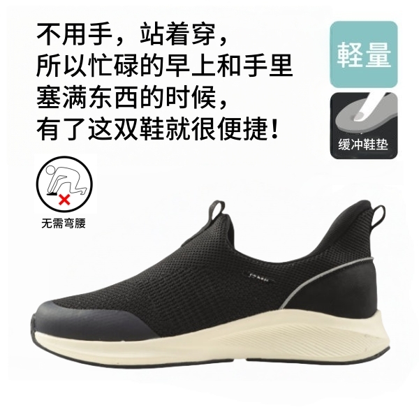 Hands-free shoes that can be put on while standing, without using hands or bending over. They are suitable for the elderly, pregnant women and people with physical inconveniences.