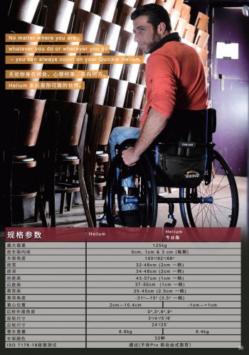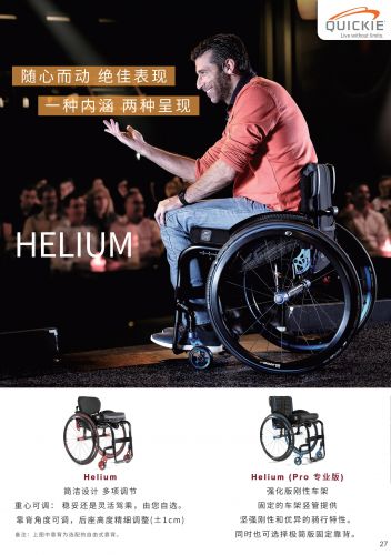 Helium設(shè)計簡潔,車架多項調(diào)節(jié),其重心位置可依用戶需求調(diào)整,后座高度可精細(xì)化調(diào)整 Helium(PRO專業(yè)版)強(qiáng)化版剛性車架,固定車架豎管提供堅強(qiáng)剛性和優(yōu)異的騎行特性。 Helium 為一款剛性設(shè)計機(jī)款,分Helium和Helium Pro兩個機(jī)款,車架采用航空級別鋁合金材質(zhì),堅固、輕便,車身與輪轂顏色多種顏色可選,多種選配件可選,是一款可依用戶需求量身定制的剛性輪椅