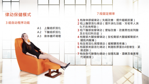 安全舒適的沙發(fā)造型,融合了運(yùn)動(dòng)前熱身,運(yùn)動(dòng)后放松,將運(yùn)動(dòng)健身與舒壓按摩合二為一。1、促進(jìn)人體一氧化氮的增生 2、活化末梢微血管促進(jìn)血液循環(huán)新陳代謝及全身細(xì)胞活化。 3、活化淋巴系統(tǒng)過濾代謝功能,提升免疫力。 4、肩、頸、腰 肌肉酸痛的緩解與預(yù)防。 5、提升副交感神經(jīng)功能,舒解壓力和產(chǎn)生鎮(zhèn)靜效果。 6、改善自律神經(jīng)失調(diào)、提升睡眠質(zhì)量。 7、刺激荷爾蒙分泌,改善更年期不適癥狀。 8、促進(jìn)腸胃消化吸收