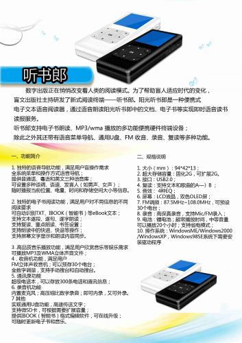 1.電子書支持TXT、VBK格式,可選普通話、粵語(yǔ)、英語(yǔ)等語(yǔ)音庫(kù),支持發(fā)音人、語(yǔ)速、語(yǔ)調(diào)、語(yǔ)音風(fēng)格、音效、背景音樂等選擇; 2.音頻播放支持MP3、WMA、WAV、OGG格式; 3.FM調(diào)頻收音功能;外錄和內(nèi)錄功能。