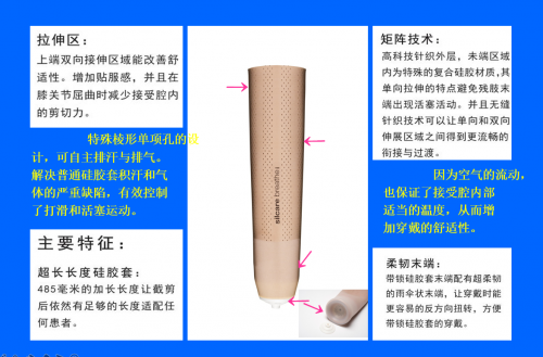 "擁有專利技術(shù)的排汗硅膠套,革命性地解決了用戶使用假肢的出汗帶來的體驗(yàn)問題; 小腿截肢使用 ; 矩陣式分布的激光精密加工小孔,可主動(dòng)排出空氣和水分 ; 無縫雙向拉伸,外形美觀的同時(shí)倍感舒適 ; 基于柔性技術(shù)的表面處理,可改善皮膚接觸剪應(yīng)力 ; 單向氣閥的使用,實(shí)現(xiàn)與殘肢的完美貼合與運(yùn)動(dòng)跟隨性;"