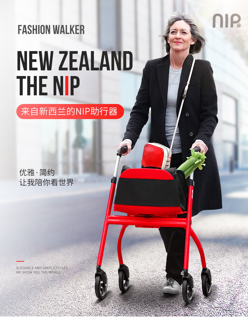 來自新西蘭的NIP助行器 1、一車兩用 購物助行 2、方便折疊、輕巧便攜 3、把手高度調節(jié) 創(chuàng)新型剎車設計 4、坐墊寬大、可折疊 5、鋁合金車架 質量更輕 6、雙色可選 美觀時尚
