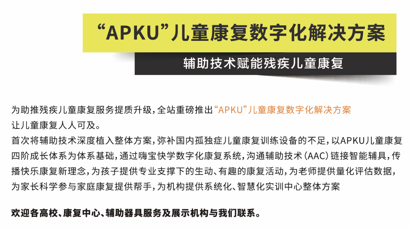 打造智慧化解決方案,讓兒童康復(fù)人人可及 為助力兒童康復(fù)服務(wù)提質(zhì)升級(jí),全站以輔助技術(shù)為核心,賦能兒童康復(fù)全過(guò)程 推出兒童康復(fù)數(shù)字化實(shí)訓(xùn)解決方案,本方案以APKU兒童康復(fù)四階段成長(zhǎng)體系為基礎(chǔ),通過(guò)數(shù)字化康復(fù)系統(tǒng)及溝通輔助技術(shù)(AAC),鏈接感統(tǒng)、言語(yǔ)等多鞥例康復(fù)智能化訓(xùn)練設(shè)備,傳播快樂(lè)康復(fù)新理念。