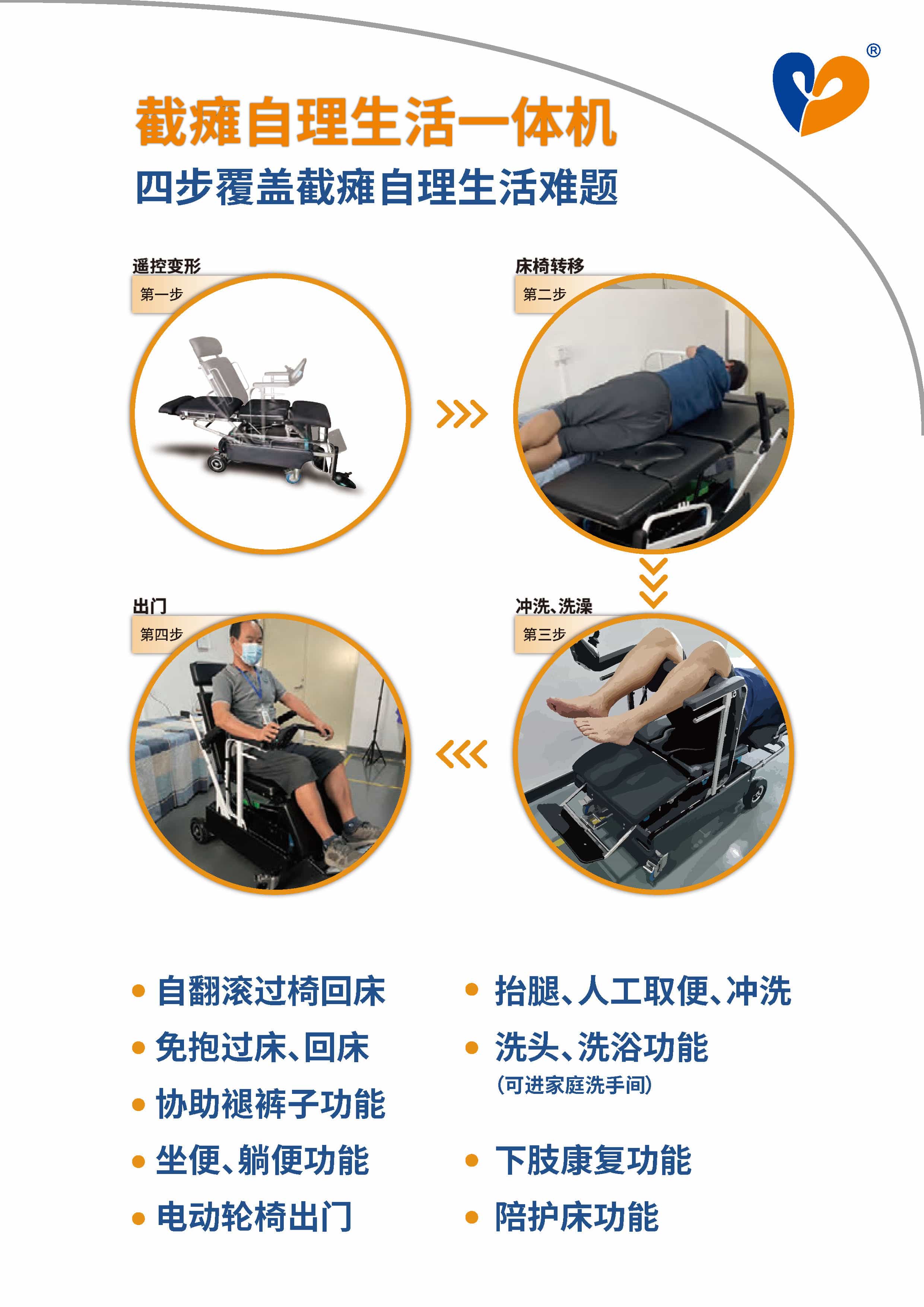 產(chǎn)品特點(diǎn): 1)解決截癱患者床、椅相互轉(zhuǎn)移痛點(diǎn),實(shí)現(xiàn)截癱患者轉(zhuǎn)移生活無(wú)障礙活動(dòng)閉環(huán); 2)解決截癱患者自己處理二便、進(jìn)浴室洗浴的基本生活問(wèn)題; 3)提高截癱患者自理能力; 4)提高截癱患者就業(yè)率; 5)提高截癱患者個(gè)人尊嚴(yán)、個(gè)人隱私。 應(yīng)用場(chǎng)景: 1.截癱患者在床上通過(guò)遙控對(duì)主機(jī)變形,使得主機(jī)與床等高并靠攏床邊、降下前扶手和靠背; 3、一部分截癱患者可以通過(guò)自身努力翻滾或上肢撐移的方式,實(shí)現(xiàn)由床轉(zhuǎn)