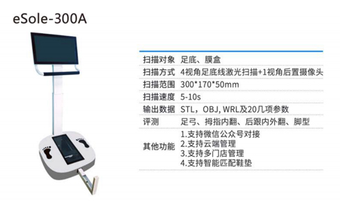 精易迅eSole-300A 足底三維掃描儀是一款專業(yè)針對(duì)人體足底三維掃描的測(cè)量設(shè)備,采用非接觸式激光掃描方式,10秒鐘內(nèi)完成人體足底的三維數(shù)據(jù)的采集,生成20幾項(xiàng)參數(shù),支持全負(fù)重,半負(fù)重或無負(fù)重足底掃描,可以有效的開展矯形鞋墊設(shè)計(jì)、個(gè)性化定制足墊、科學(xué)選鞋、足病診斷和足病矯正等多種工作;廣泛應(yīng)用于醫(yī)療、體育、鞋店零售等領(lǐng)域