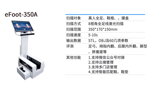 eFoot-350-A腳型3D掃描儀(單腳)可對人體腳型,鞋楦楦型進行三維掃描,采集高精度腳型和楦型3D數(shù)據(jù),并生成60幾組個性化測量參數(shù),支持上傳與下載,廣泛用于制鞋產(chǎn)業(yè)與醫(yī)療康復(fù)領(lǐng)域.