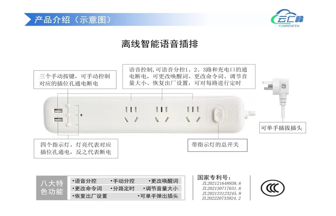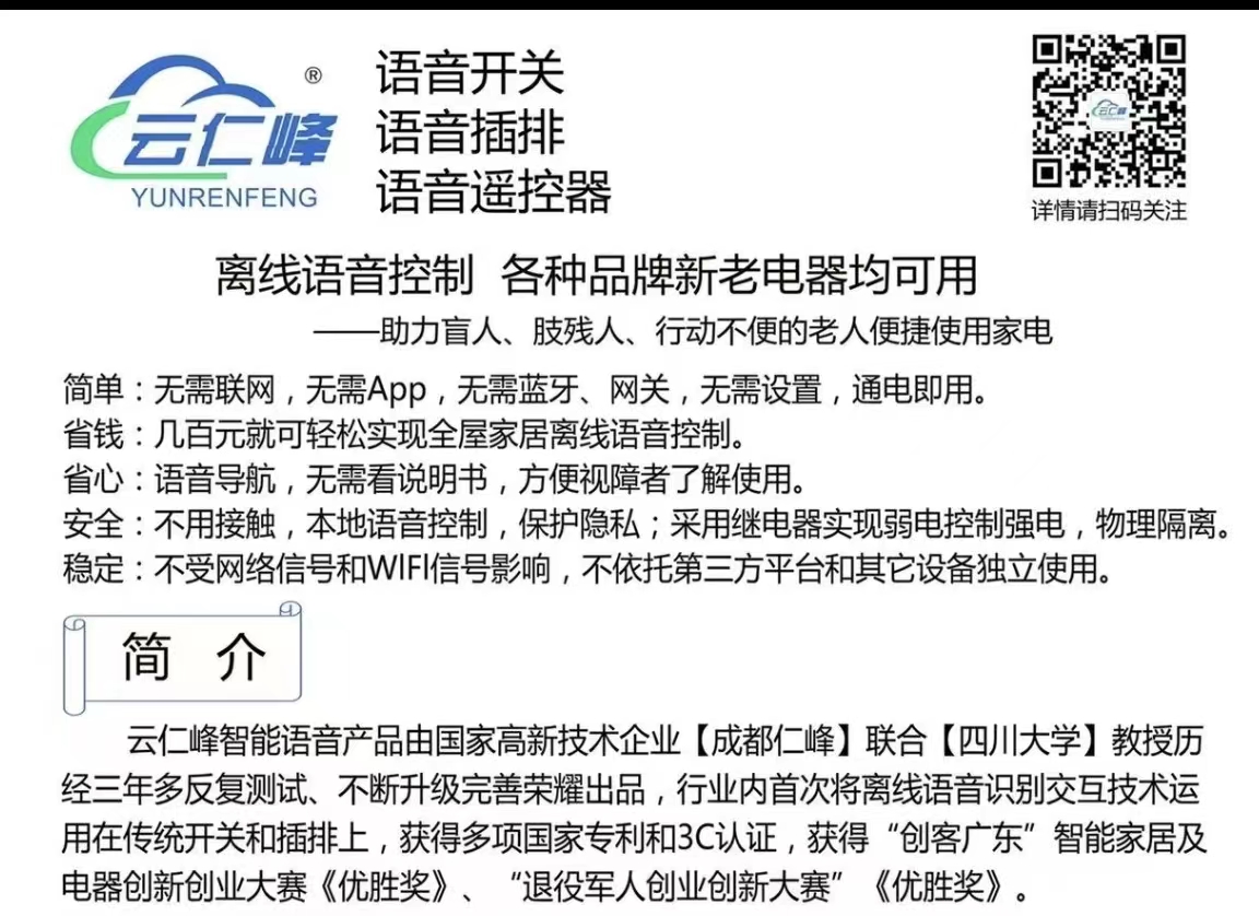 離線語音控制 各種品牌新老電器均可用 ——助力盲人、肢殘人、行動不便的老人便捷使用家電 簡單:無需聯(lián)網(wǎng),無需App,無需藍牙、網(wǎng)關(guān),無需設(shè)置,通電即用。 省錢:幾百元就可輕松實現(xiàn)全屋家居離線語音控制。 省心:語音導(dǎo)航,無需看說明書。 安全:不用接觸,本地語音控制,保護隱私;采用繼電器實現(xiàn)弱電控制強電,物理隔離。 穩(wěn)定:不受網(wǎng)絡(luò)信號和WlFl信號影響,不依托第三方平臺和其它輔助設(shè)備獨立使用。