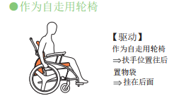 一臺三用的步行器兼輪椅車,外觀時尚,三種使用方式,可作為步行器使用的輪椅,外出時的強力支撐。有鋁合金輪圈和樹脂輪圈可選。