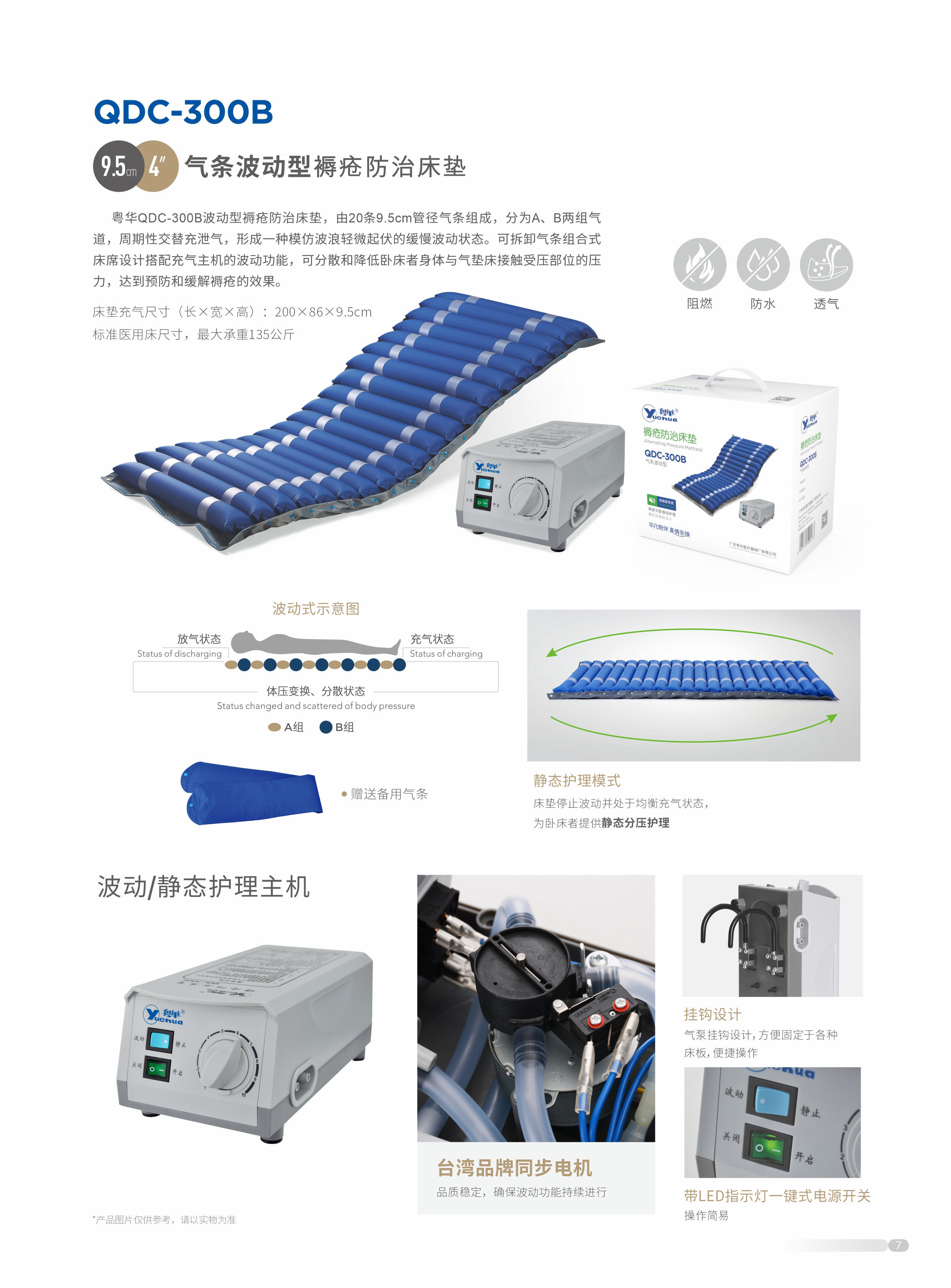 粵華QDC-300B波動(dòng)型褥瘡防治床墊,由20條9.5cm管徑氣條組成,分為A、B兩組氣道,周期性交替充泄氣,形成一種模仿波浪輕微起伏的緩慢波動(dòng)狀態(tài)??刹鹦稓鈼l組合式床席設(shè)計(jì)搭配充氣主機(jī)的波動(dòng)功能,可分散和降低臥床者身體與氣墊床接觸受壓部位的壓力,達(dá)到預(yù)防和緩解褥瘡的效果。