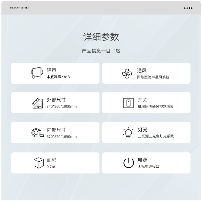 型號(hào):S80 隔聲:室外環(huán)境噪聲≤55dB (A),室內(nèi)本底噪聲≤28dB (A) 環(huán)保:甲醛釋放量≤0.4mg/L,滿足《室內(nèi)裝飾裝修材料及人造板棉制品中甲醛釋放量》 參考標(biāo)準(zhǔn): JJF 1191-2019《測(cè)聽室聲學(xué)特性校準(zhǔn)規(guī)范》 GB 3096-2022《聲環(huán)境質(zhì)量標(biāo)準(zhǔn)》 GB 50325-2020《民用建筑工程室內(nèi)環(huán)境污染控制標(biāo)準(zhǔn)》 適用范圍:聽力體檢、車載聽力篩查