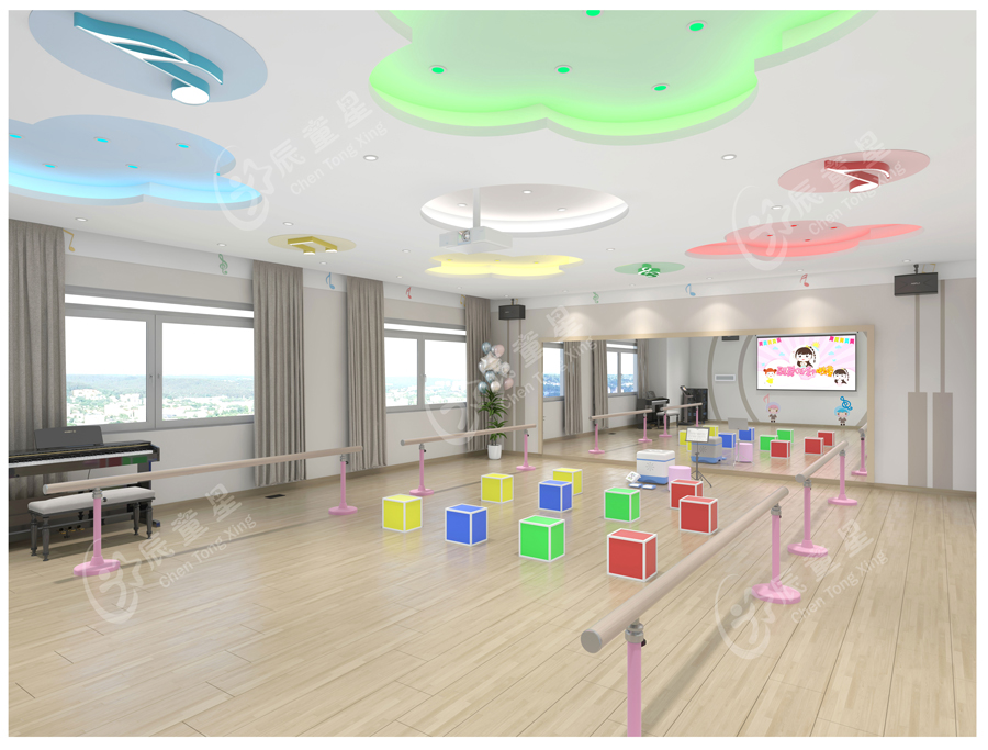 音樂律動室是聽障、盲障、智力障礙學生進行舞蹈、體操、游戲、音樂教學及其它藝術活動的場所,其環(huán)境設計有利于特殊學生通過視覺和殘余聽力模仿動作、感受舞蹈的音樂節(jié)奏。律動教室通過訓練學生的視、聽、觸等綜合能力,使其注意力、記憶力、感知力、結(jié)構(gòu)化能力得到加強。