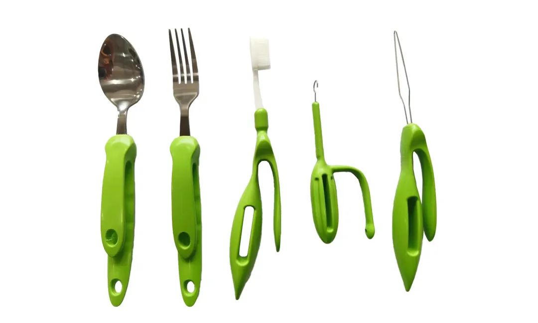 套裝由記憶成人勺子、記憶成人叉子、記憶成人牙刷、拉鏈輔助器、穿扣器5種產(chǎn)品組成。這些產(chǎn)品手柄材質(zhì)為形狀記憶聚合物,握柄可多次加熱軟化重新塑型,握柄的材質(zhì)無毒、無害、抗菌環(huán)保、易于清潔、不易退色。適用于手關(guān)節(jié)僵直、變形,身體活動障礙人群使用。