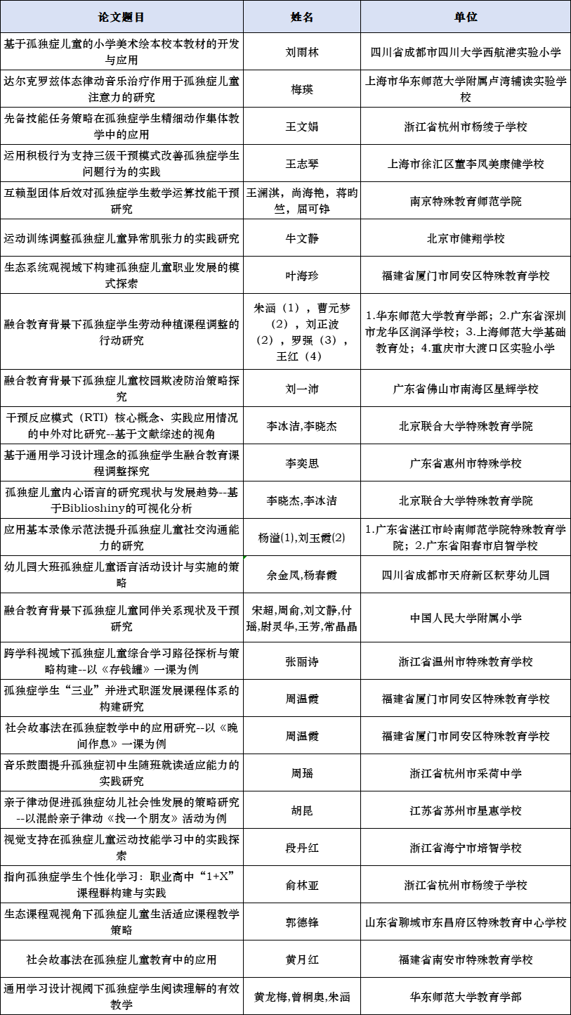 公布第一屆孤獨癥教育教學(xué)征集優(yōu)秀組織單位,優(yōu)秀、創(chuàng)新和鼓勵論文名單;公布第一屆孤獨癥教學(xué)案例優(yōu)秀組織單位,優(yōu)秀、創(chuàng)新和鼓勵課例名單