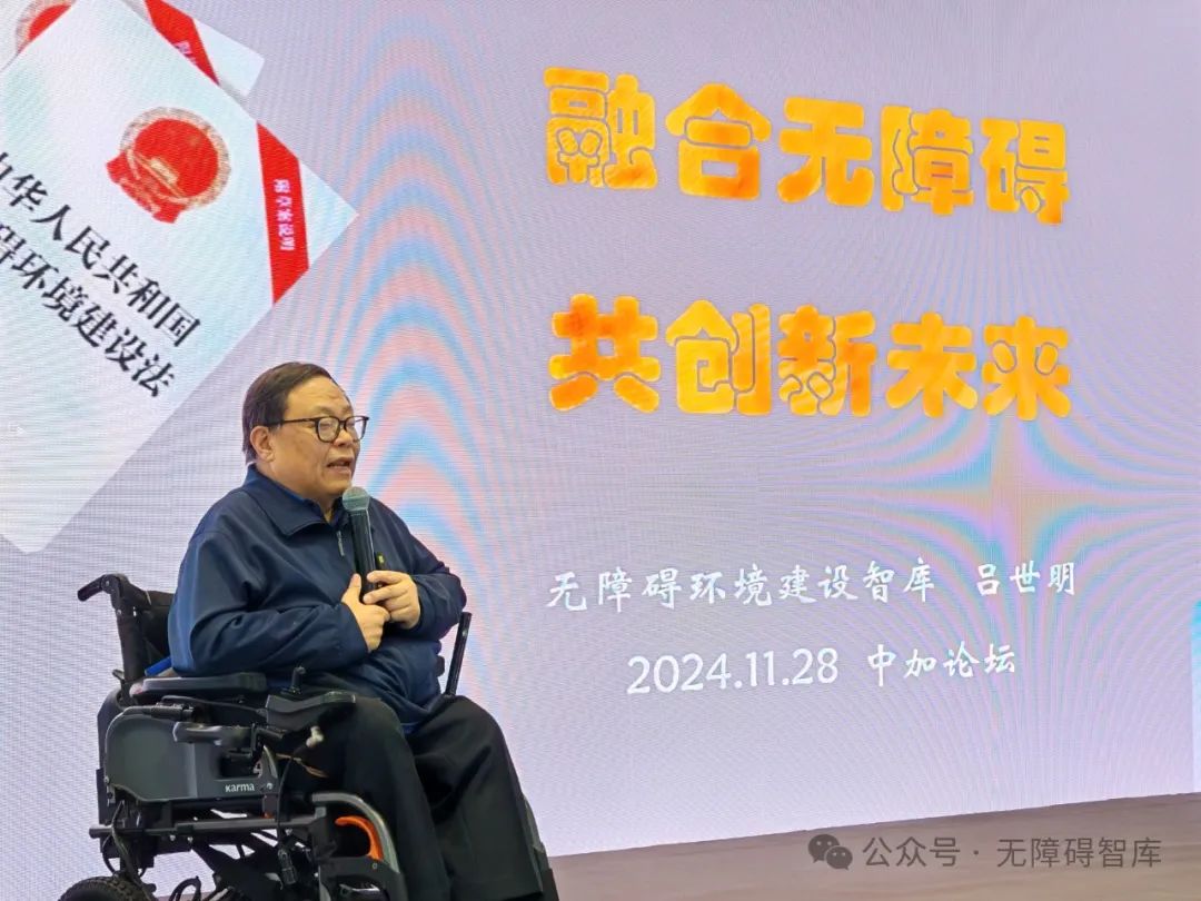 上圖為中國助殘志愿者協(xié)會(huì)會(huì)長(zhǎng)呂世明作題為《融合無障礙 共創(chuàng)新未來》的主旨報(bào)告