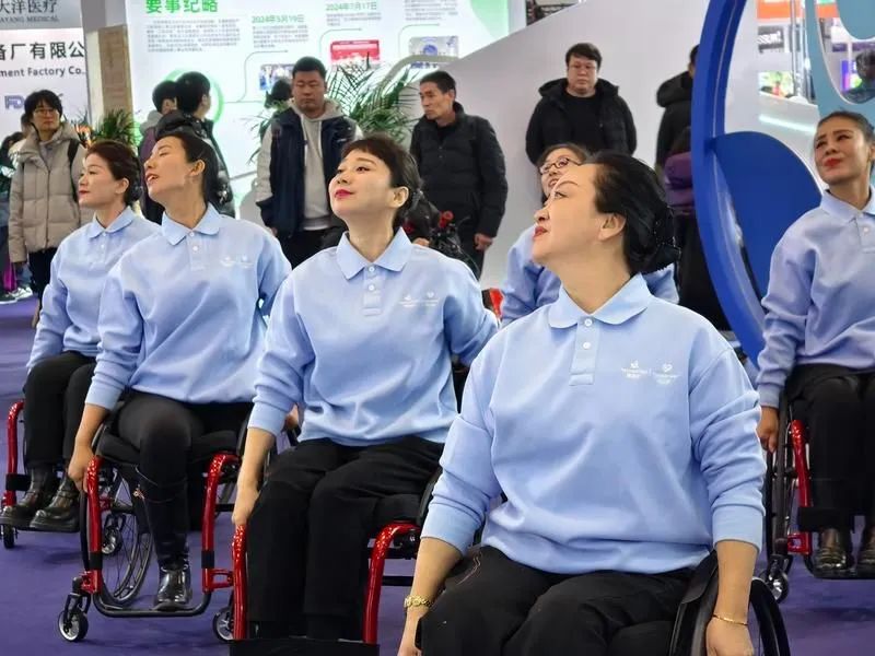 11月28日,2024中國(guó)國(guó)際福祉博覽會(huì)暨中國(guó)國(guó)際康復(fù)博覽會(huì)上,王曦婭(右)與朋友們一起表演。劉胤衡/攝