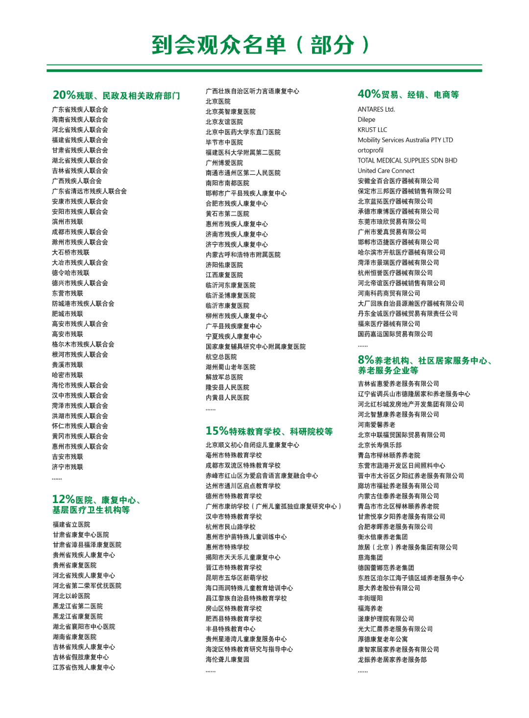 助行移動輔具展區(qū) 假肢及矯形器展區(qū) 醫(yī)療器械/康復展區(qū) 聽覺言語康復與低視力展區(qū) 老年用品及護理/無障礙展區(qū) 海外展區(qū)