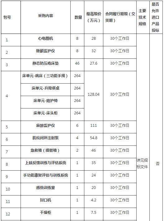 動態(tài)心電儀1臺、排痰機(jī)1臺、霧化器1臺、電動多功能床3張、糖尿病治療儀1臺、微循環(huán)修復(fù)系統(tǒng)1套、熏蒸儀1臺、輪椅3把、幽門螺旋桿菌測定儀1臺(含設(shè)備運(yùn)輸、安裝、調(diào)試及售后具體參數(shù)詳見招標(biāo)文件)。