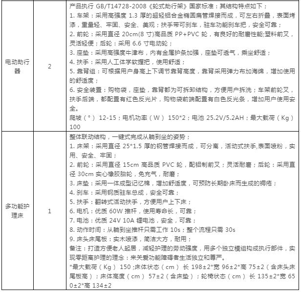 采購產(chǎn)品及數(shù)量:輪椅2300輛;助行器10個;電動助行器2個;多功能護(hù)理床1張。