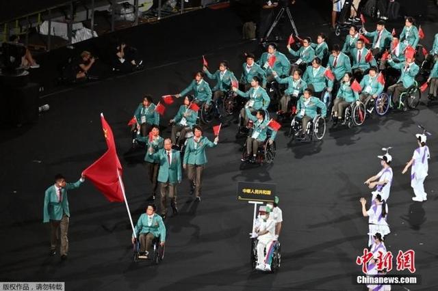 與東京奧運會開幕式一樣,2020東京殘奧會開幕式也采取無觀眾形式。中國代表團在“雙旗手”女子輪椅射箭運動員周佳敏、男子肢殘?zhí)飶竭\動員王浩的帶領下入場。