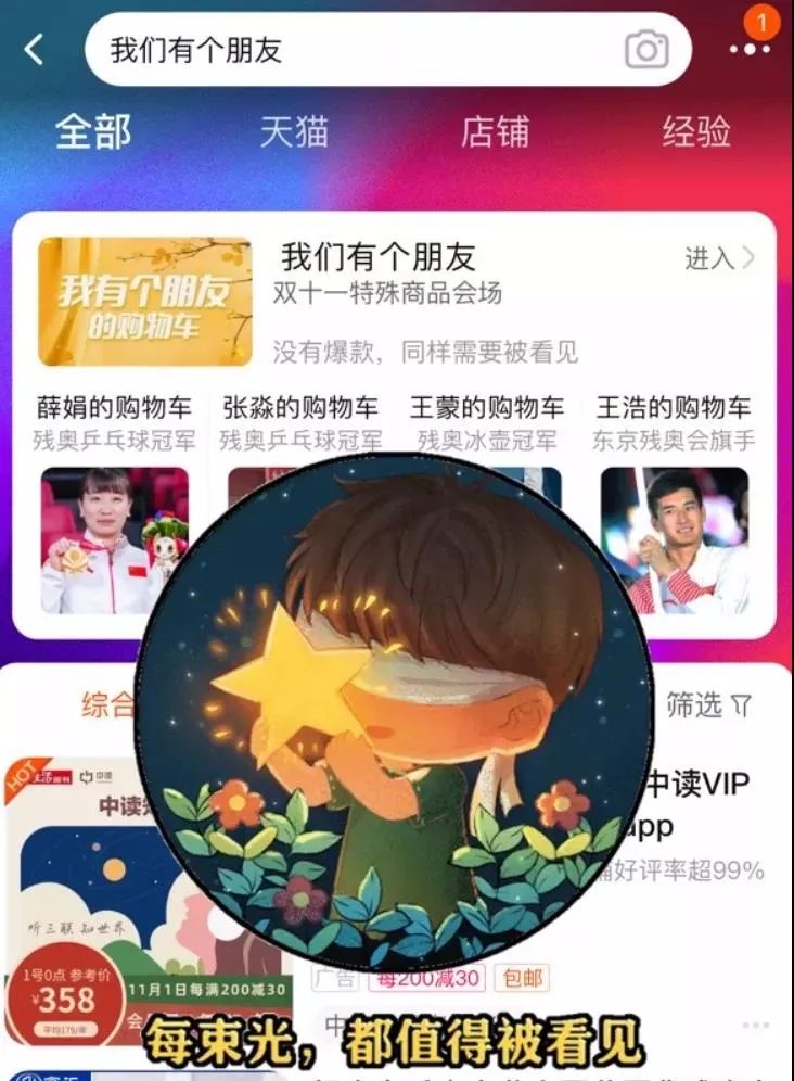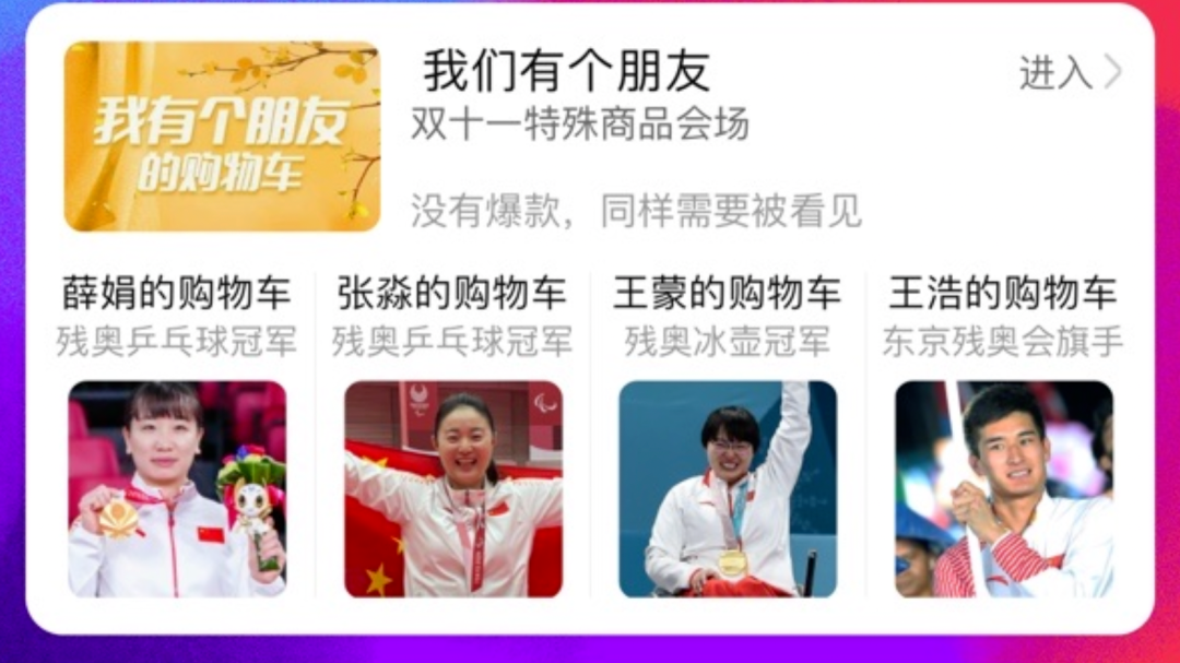 這個(gè)“隱藏會(huì)場(chǎng)”還能看到薛娟、張淼、王蒙和王浩這4位殘奧會(huì)冠軍分享的雙11購(gòu)物車(chē)。
