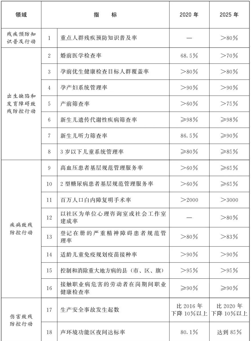 到2025年,覆蓋經(jīng)濟(jì)社會發(fā)展各領(lǐng)域的殘疾預(yù)防政策體系進(jìn)一步完善,全人群全生命周期殘疾預(yù)防服務(wù)網(wǎng)絡(luò)更加健全,全民殘疾預(yù)防素養(yǎng)明顯提升,遺傳和發(fā)育、疾病、傷害等主要致殘因素得到有效防控,殘疾康復(fù)服務(wù)狀況持續(xù)改善,殘疾預(yù)防主要指標(biāo)處于中高收入國家前列。