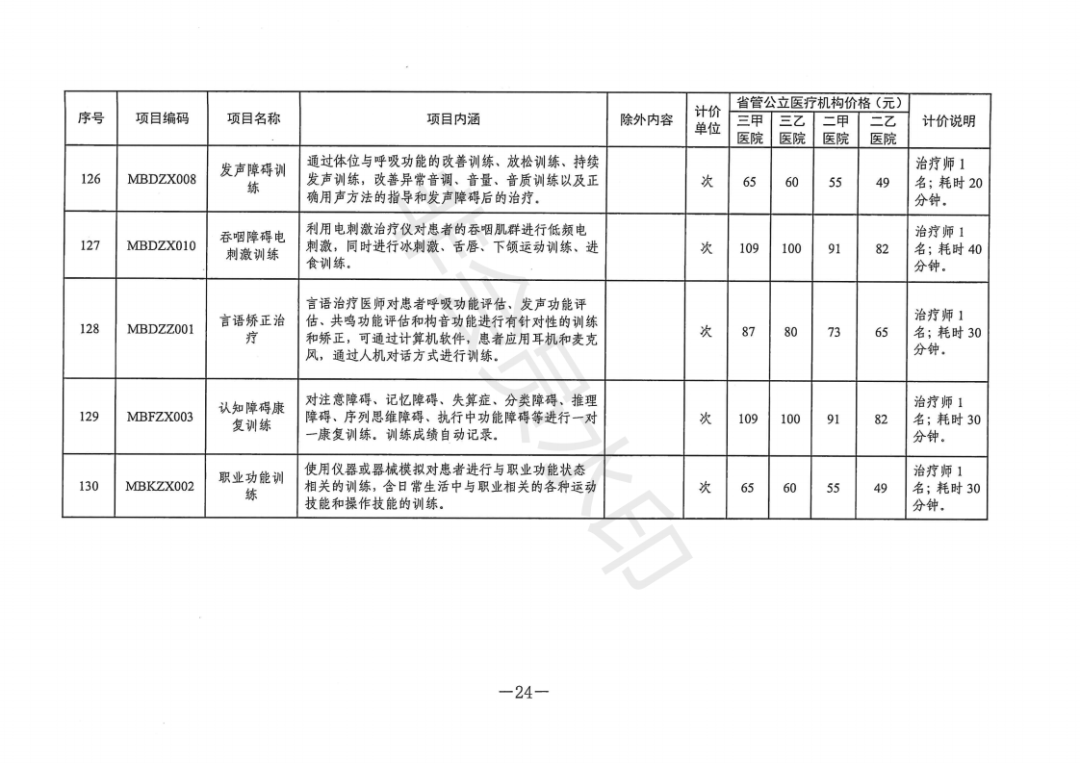 文體訓(xùn)練,有明確身心功能障礙(肢體、語(yǔ)言、認(rèn)知、心理、社交、情感等)的患者,一個(gè)疾病過(guò)程支付不超過(guò)180天,每日不超過(guò)1次。