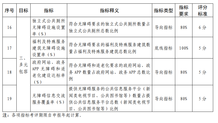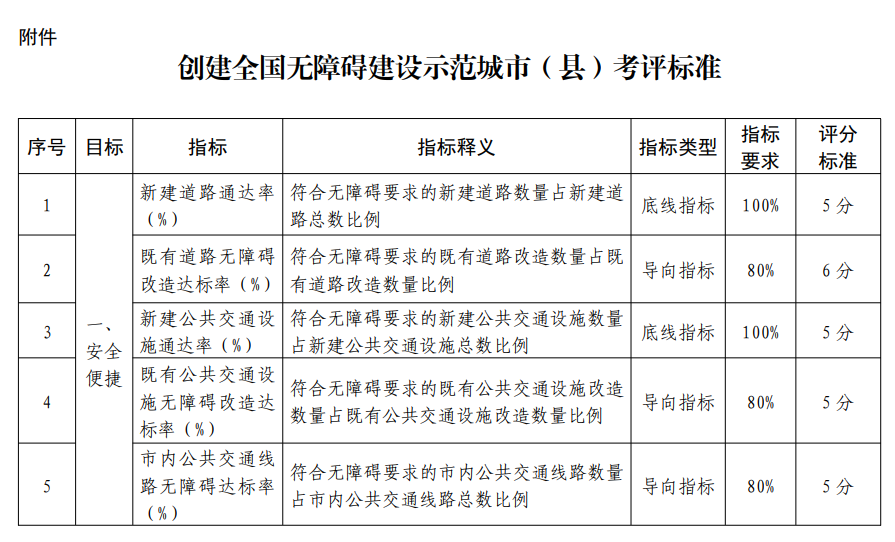 ?。ㄒ唬φ铡秳?chuàng)建全國無障礙建設(shè)示范城市(縣)考評標準》,提出創(chuàng)建目標、制定創(chuàng)建工作方案,編制無障礙環(huán)境建設(shè)發(fā)展規(guī)劃,制定無障礙設(shè)施建設(shè)和改造計劃,在創(chuàng)建周期內(nèi)能夠達到相應(yīng)要求;