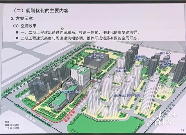 在空間效果方面,一、二期工程建筑通過連廊聯(lián)系,打造一體化、便捷化的康復(fù)建筑群。優(yōu)化提升的規(guī)劃提出,要控制二期工程建筑高度,舒緩其對廣州市中級人民法院的壓迫,沿啟德路界面空間形態(tài)和諧、視覺感覺舒緩。