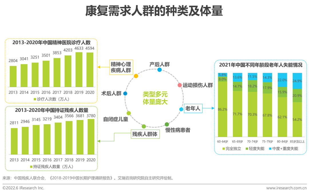 由于人口老齡化加劇及百姓健康消費需求升級等多重原因,康復(fù)醫(yī)療正迎來重要發(fā)展機(jī)遇期,康復(fù)醫(yī)療需求群體不斷擴(kuò)大。根據(jù)《柳葉刀》研究統(tǒng)計,我國為全球康復(fù)需求最大的國家,2019年康復(fù)需求總?cè)藬?shù)達(dá)到4.6億人。從當(dāng)下康復(fù)患者畫像來看,包含老年人、慢性病患者、殘疾人群體、術(shù)后人群、自閉癥兒童等。艾瑞認(rèn)為,隨著患者康復(fù)意識的覺醒,整體康復(fù)需求正在從傳統(tǒng)型向消費型逐漸轉(zhuǎn)變,產(chǎn)后康復(fù)、運(yùn)動康復(fù)、精神及心理康復(fù)將受到更廣泛的關(guān)注。