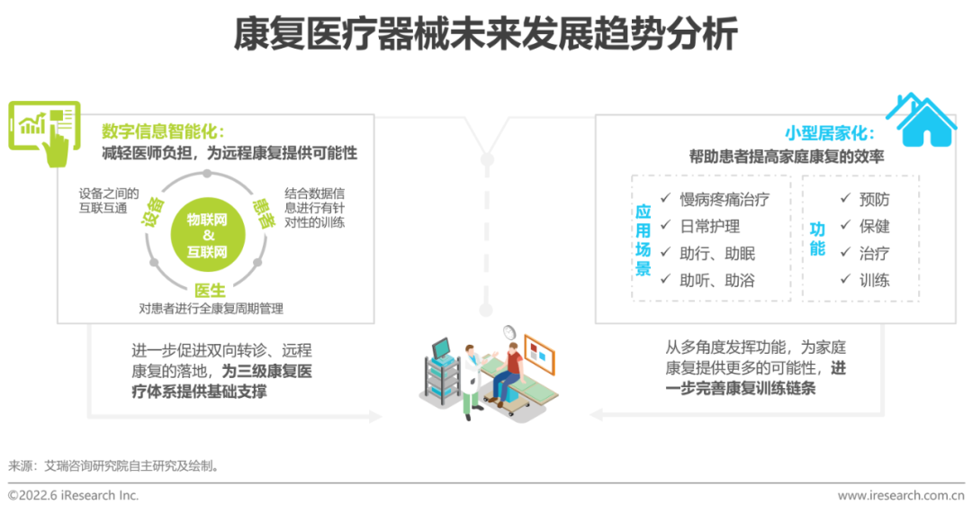 隨著深度學(xué)習(xí)、語音交互、計算機(jī)視覺、物聯(lián)網(wǎng)等技術(shù)的不斷發(fā)展及融合,未來將實現(xiàn)康復(fù)醫(yī)療器械之間、器械與醫(yī)生、患者之間的信息互通,進(jìn)一步促進(jìn)對患者全康復(fù)周期的管理與優(yōu)化,同時,對器械設(shè)備及安全性的智能化管控也能夠?qū)崿F(xiàn)醫(yī)療資源的合理配置,從而提高醫(yī)療機(jī)構(gòu)設(shè)備的管理效率。另外,基于目前我國康復(fù)醫(yī)療相關(guān)人才及服務(wù)短缺、人口老齡化、國民收入日漸增長的實際情況,消費級的小型康復(fù)醫(yī)療器械產(chǎn)品會逐漸走進(jìn)千家萬戶,用于慢病疼痛治療、日常護(hù)理等方面,使患者在預(yù)防、保健、治療、訓(xùn)練等環(huán)節(jié)中更方便快捷, 補(bǔ)足患者康復(fù)訓(xùn)練中家庭康復(fù)這一重要環(huán)節(jié),同在醫(yī)院及專業(yè)機(jī)構(gòu)中使用到的大型康復(fù)醫(yī)療器械起到互相補(bǔ)充及銜接作用。