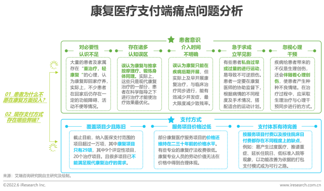 康復(fù)醫(yī)療的發(fā)展很大程度上需要支付端的不斷推動,目前我國人均康復(fù)花費較低,對于市場的進(jìn)一步擴(kuò)容造成了阻礙。艾瑞認(rèn)為,目前我國康復(fù)醫(yī)療支付端的痛點問題主要集中在兩方面,首先,患者對于整體康復(fù)醫(yī)療的意識與認(rèn)知仍存在偏差,在康復(fù)方面投入資金的意愿不強(qiáng);其次,我國的醫(yī)保體系所覆蓋的康復(fù)類項目少且并沒有隨著醫(yī)療技術(shù)的發(fā)展而調(diào)整項目類型和項目價格,不符合目前的社會價值,整體體系有待完善,同時商保覆蓋率極低,目前只有少數(shù)高端商保有所涉及。