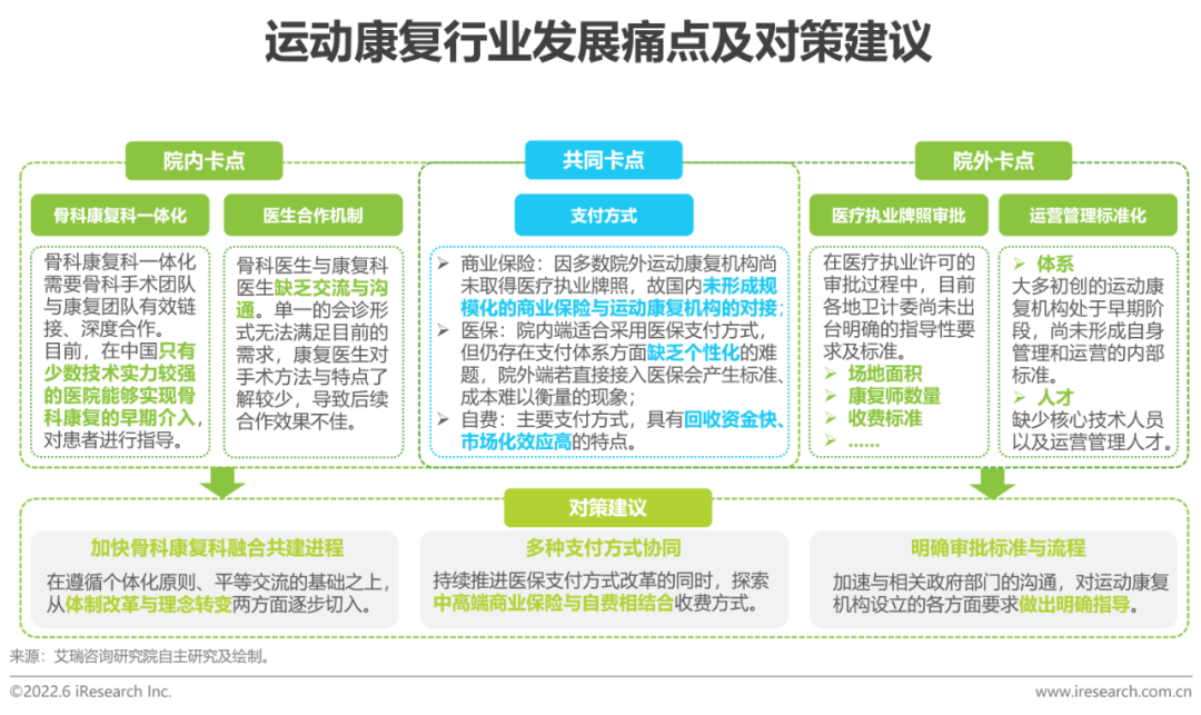 近年來我國運(yùn)動康復(fù)行業(yè)發(fā)展迅速,但同歐美、澳洲乃至香港、臺灣等地區(qū)的成熟產(chǎn)業(yè)相比仍有較大差距,且面臨著一系列的挑戰(zhàn)及制約因素。院內(nèi)痛點主要體現(xiàn)在體制建設(shè)與醫(yī)生合作機(jī)制兩方面,構(gòu)建骨科和康復(fù)科平等交流的平臺是重中之重;而對于院外機(jī)構(gòu)而言,醫(yī)療執(zhí)業(yè)許可的獲得是一大難題,我國目前仍缺少明確的指導(dǎo)性要求及標(biāo)準(zhǔn),這會導(dǎo)致院外端各門店的運(yùn)營及整體市場混亂;綜合來看,無論院內(nèi)還是院外,如何實現(xiàn)支付方式合理化是運(yùn)動康復(fù)行業(yè)長遠(yuǎn)發(fā)展過程中必須要解決的問題,商業(yè)保險、醫(yī)保、自費如何實現(xiàn)有機(jī)結(jié)合仍需探索。