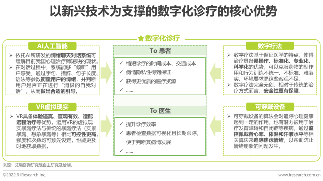 精神心理疾病的治療康復(fù)主要通過醫(yī)生觀察患者以及聽患者講述自身情況進(jìn)行判斷,并以溝通和口服藥物作為主要治療手段,對醫(yī)療器械和實驗室檢查的依賴性較低,具有天然的數(shù)字化屬性。加上患者大多對精神心理疾病抱有“病恥感”,線上問診的形式可以有效弱化患者的就診抵觸心理。在供給側(cè)不變的情況下通過技術(shù)進(jìn)行資源的重新整合和配置,讓遠(yuǎn)在三四線城市患有精神心理問題的患者能夠通過遠(yuǎn)程診療獲得在一線城市專家的問診。對于醫(yī)生而言,數(shù)字化診療能夠幫助醫(yī)生對患者的病情有長期式的跟蹤了解,從而提升診療效率。