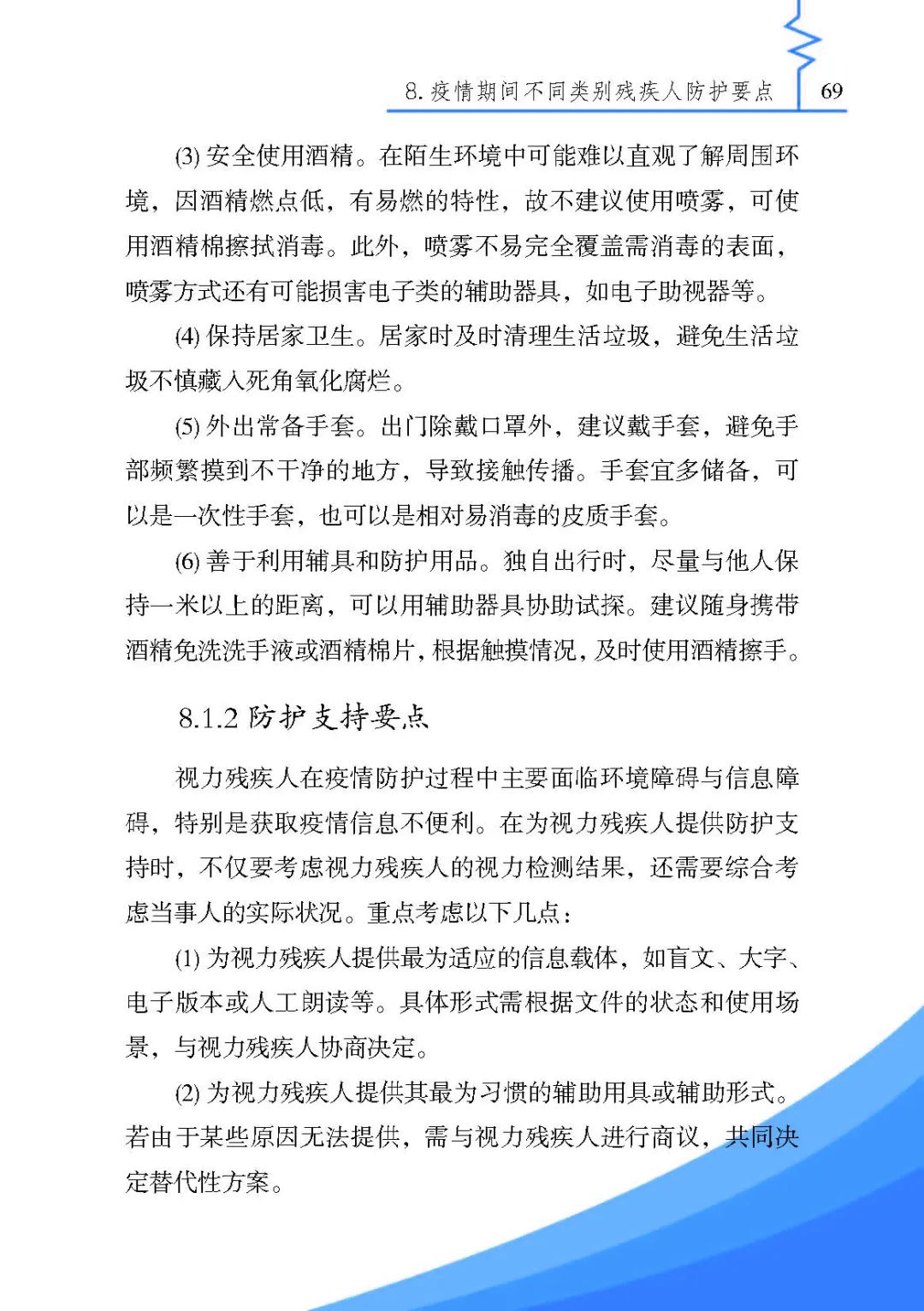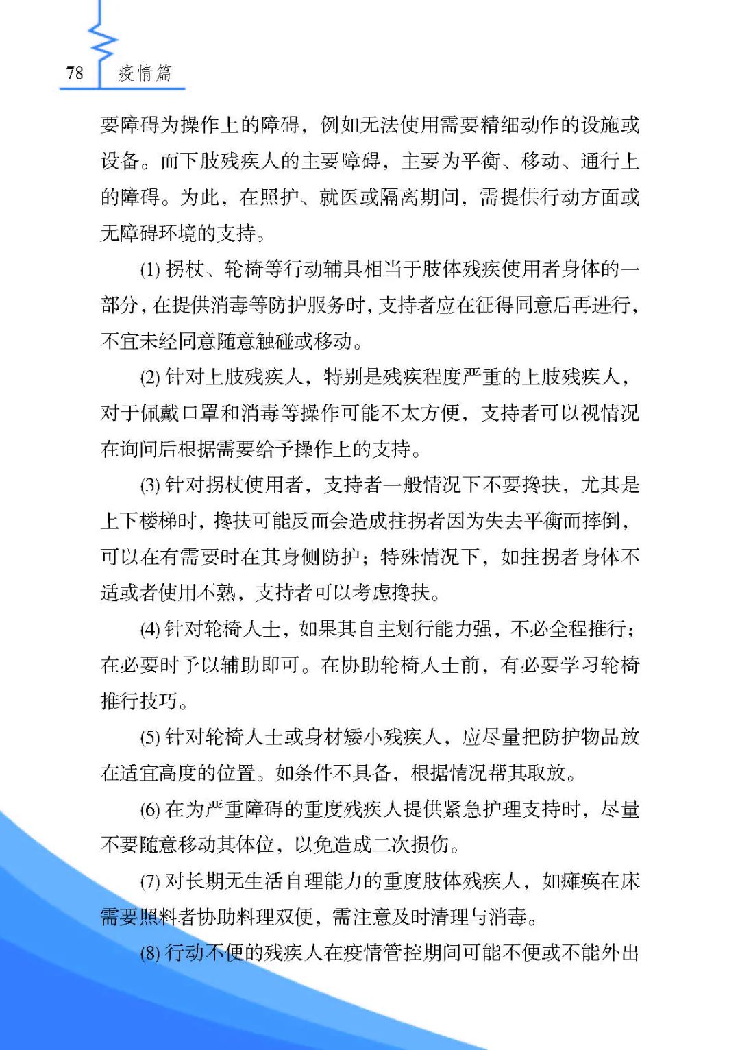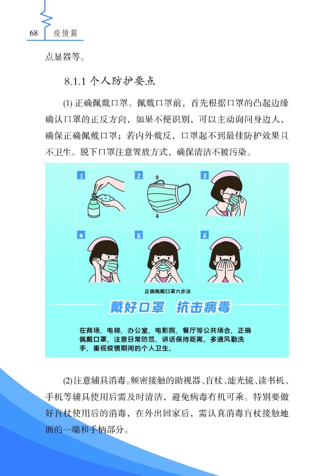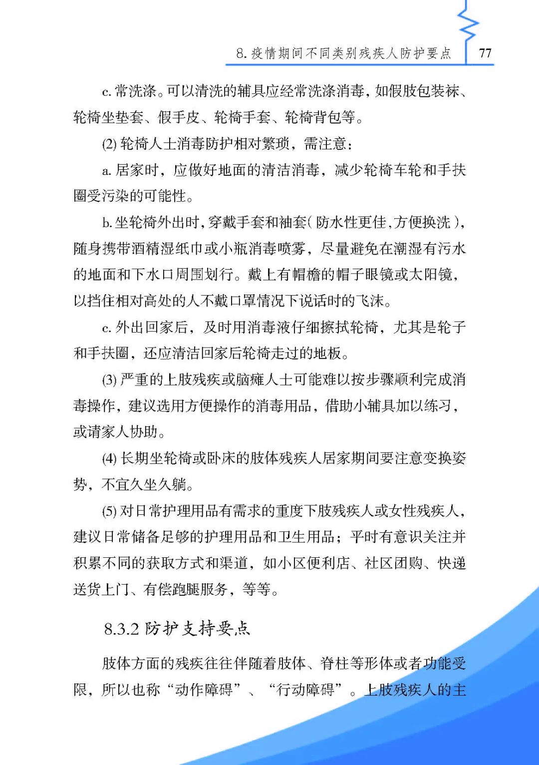 疫情給殘疾人帶來了身心健康、照護、經(jīng)濟等多方面的挑戰(zhàn),日常生活中,殘疾人應(yīng)如何做好防護呢?為做好殘疾人群體疫情防控工作,幫助殘疾人朋友科學(xué)防疫,當(dāng)好自己健康的第一責(zé)任人,中國殘疾人聯(lián)合會組織編寫了《殘疾人安全防護實用手冊·疫情篇》。
