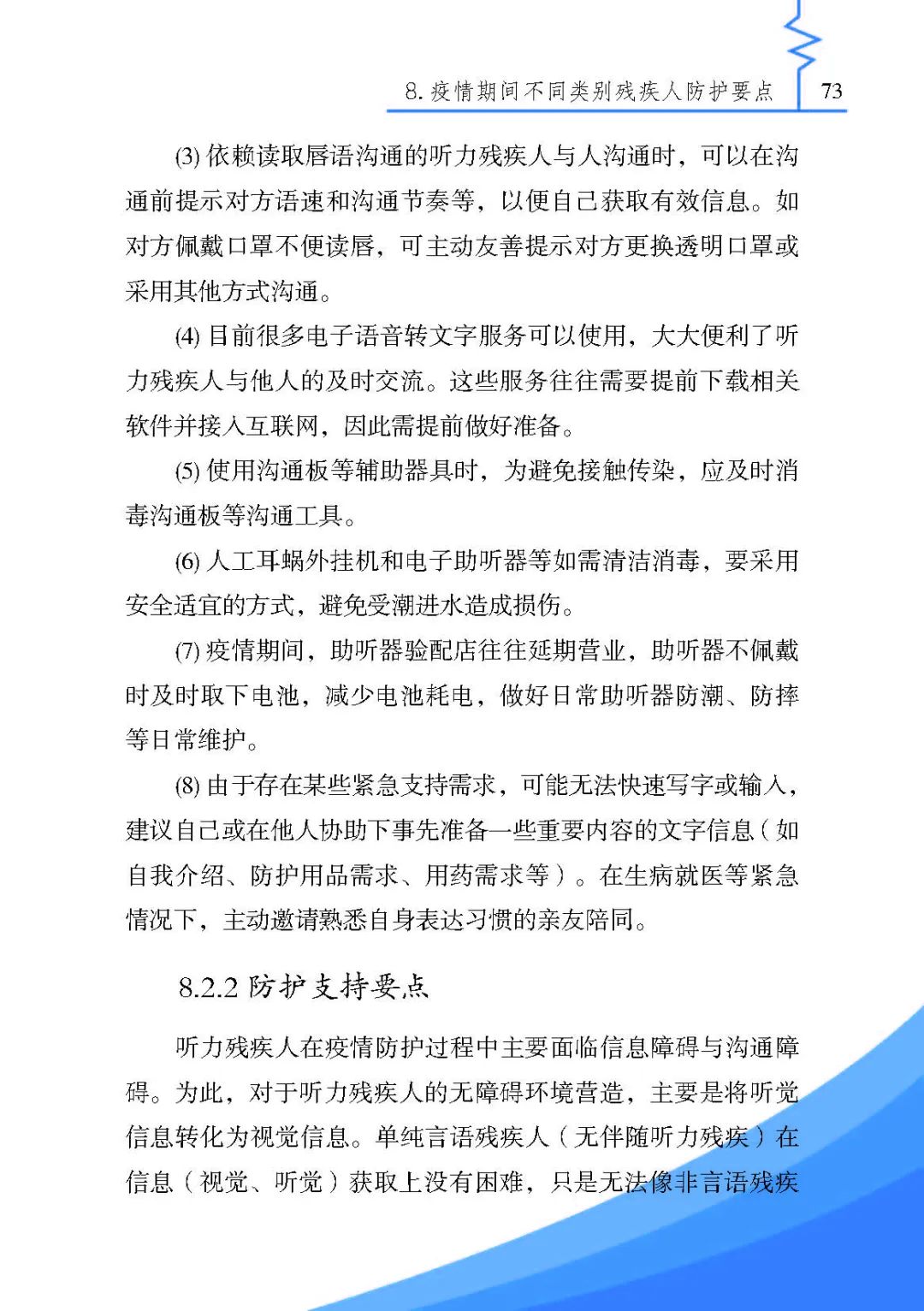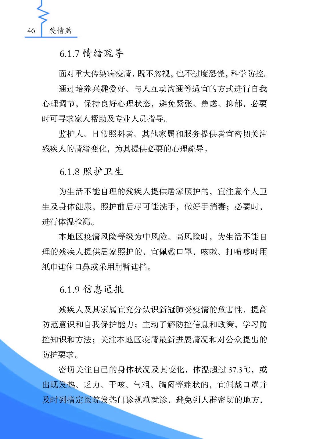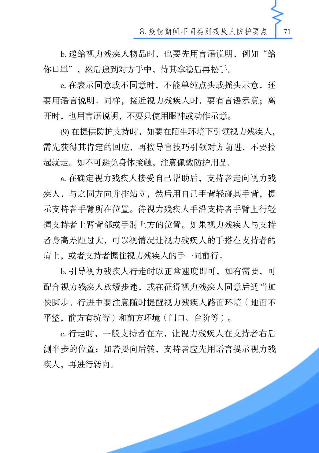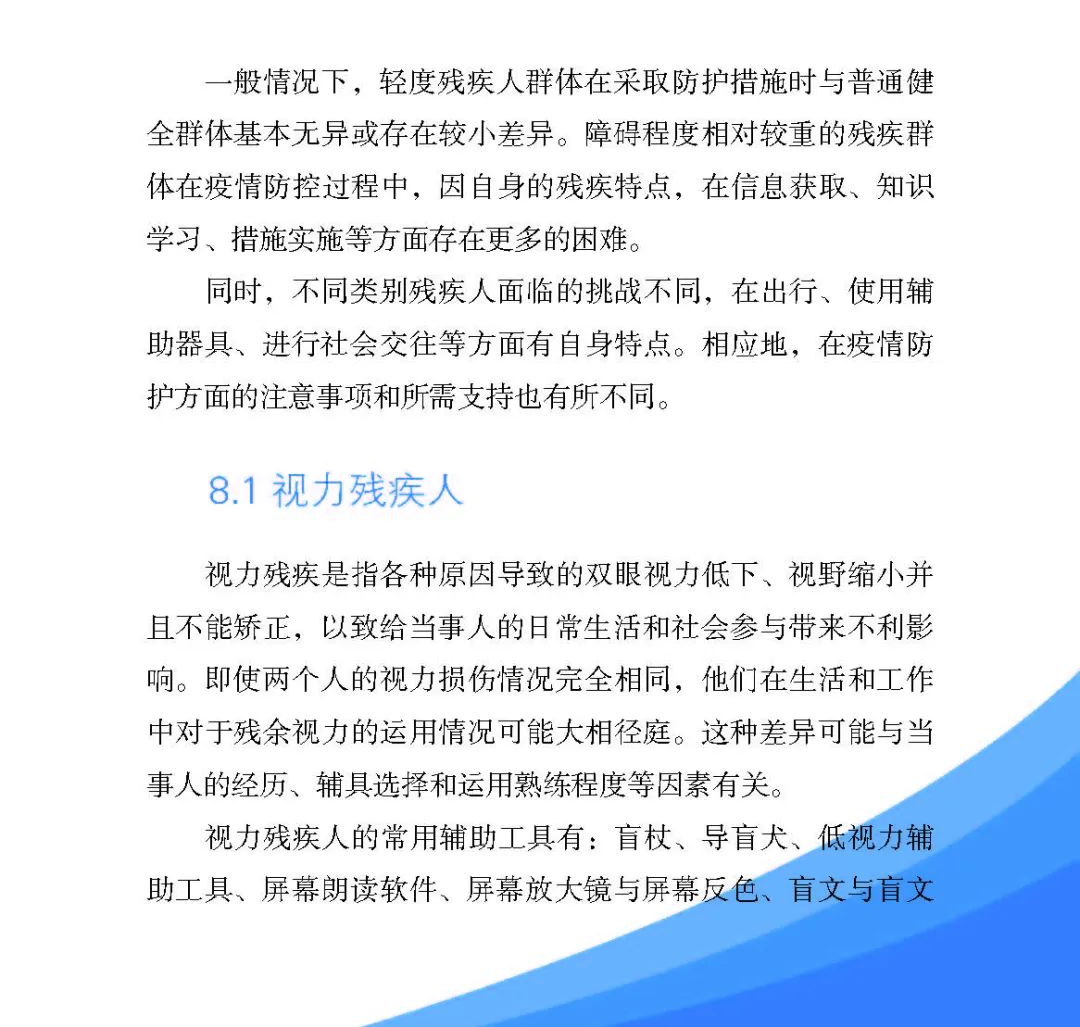 疫情給殘疾人帶來了身心健康、照護、經(jīng)濟等多方面的挑戰(zhàn),日常生活中,殘疾人應(yīng)如何做好防護呢?為做好殘疾人群體疫情防控工作,幫助殘疾人朋友科學(xué)防疫,當(dāng)好自己健康的第一責(zé)任人,中國殘疾人聯(lián)合會組織編寫了《殘疾人安全防護實用手冊·疫情篇》。