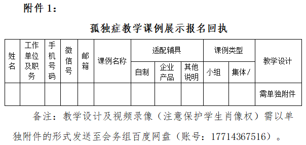 課例類型不限(不建議個訓(xùn),鼓勵集體或小組課,盡量使用相關(guān)教具、學(xué)具或輔具)。鼓勵老師們自己制作輔具,不容許出現(xiàn)廠家名字或任何企業(yè)標(biāo)志及信息。參加單位需同時提供輔具名稱和孤獨(dú)癥學(xué)生的教學(xué)設(shè)計方案及視頻錄像(注意保護(hù)學(xué)生肖像權(quán)),MP4格式,確保視頻清晰,總時長20-35分鐘,主要與孤獨(dú)癥相關(guān)的教學(xué)內(nèi)容與過程要在屏幕上有文字顯示。成果一經(jīng)征集,頒發(fā)證書。