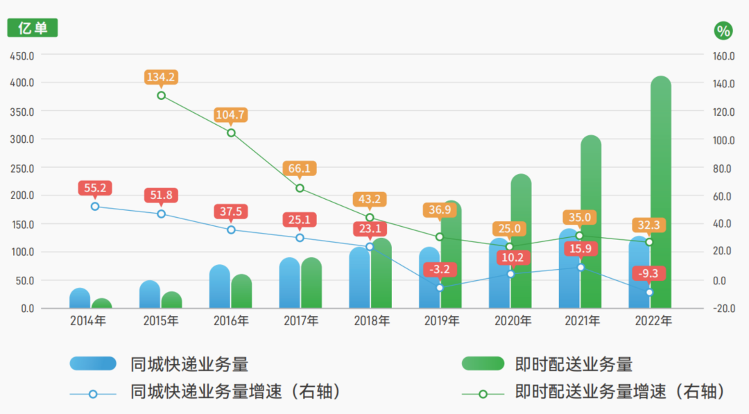 2014-2022年同城快遞和即時配送業(yè)務(wù)量和增速