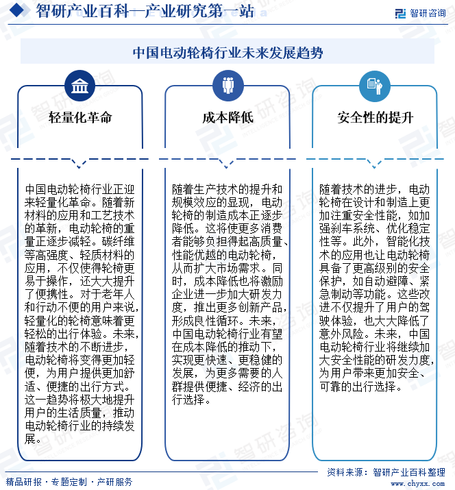 隨著中國人口老齡化的逐漸加劇,對電動輪椅等康復(fù)輔助器具的需求持續(xù)增長。國家通過相關(guān)政策推動康復(fù)醫(yī)療與康復(fù)輔助器具配置服務(wù)的銜接融合,為電動輪椅等產(chǎn)品的市場需求提供了有力保障。2024年1月,國務(wù)院印發(fā)《關(guān)于發(fā)展銀發(fā)經(jīng)濟增進老年人福祉的意見》,提出大力發(fā)展康復(fù)輔助器具產(chǎn)業(yè)。推動助聽器、矯形器、拐杖、假肢等傳統(tǒng)功能代償類康復(fù)輔助器具升級,發(fā)展智能輪椅、移位機、康復(fù)護理床等生活照護產(chǎn)品。在政策推動下,電動輪椅行業(yè)將加快技術(shù)創(chuàng)新和產(chǎn)品升級。隨著政策的推動和市場需求的增長,電動輪椅行業(yè)將逐漸實現(xiàn)標(biāo)準(zhǔn)化和規(guī)范化發(fā)展。這將有助于提升產(chǎn)品的質(zhì)量和安全性,降低生產(chǎn)成本和售價,進一步促進市場的擴大和普及。