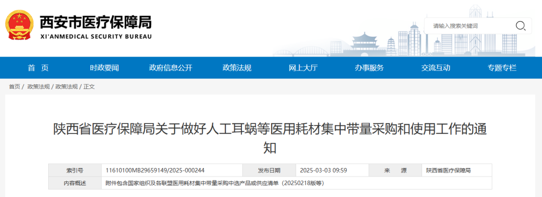 3月3日,陜西省醫(yī)療保障局發(fā)布《關(guān)于做好人工耳蝸等醫(yī)用耗材集中帶量采購和使用工作的通知》,其中指出,自2025年3月31日起執(zhí)行人工耳蝸、乳房旋切針、血管組織閉合用結(jié)扎夾、導引導管和導引導絲、預充式導管沖洗器等醫(yī)用耗材集中帶量采購中選結(jié)果;自2025年5月1日起執(zhí)行外周血管支架集采中選結(jié)果。其中人工耳蝸、外周血管支架、乳房旋切針采購周期3年,血管組織閉合用結(jié)扎來、導引導管和導引導絲接續(xù)采購周期2年,預充式導管沖洗器采購周期1年。