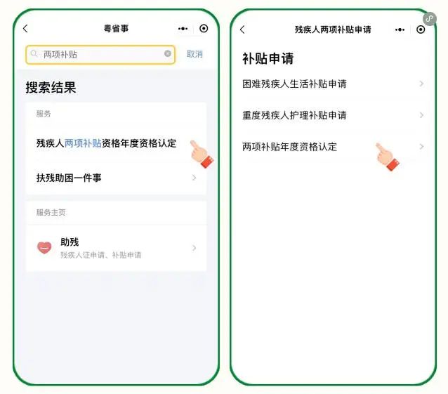 進(jìn)入“粵省事”APP或微信小程序,首頁搜索“兩項(xiàng)補(bǔ)貼”,點(diǎn)擊【殘疾人兩項(xiàng)補(bǔ)貼資格年度資格認(rèn)定】,按提示操作進(jìn)行資格認(rèn)定。