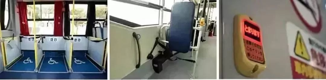 公交車內(nèi)還設(shè)有可折疊的殘疾人專用座位和固定輪椅用的皮帶,以及用于殘障人士向司機(jī)呼叫或告知下車的專用按鈕。