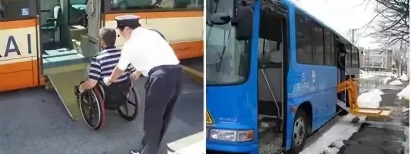 日本的公交車在車門處設(shè)置了像抽屜一樣的專用坡道,使用時司機(jī)將坡道抽出并根據(jù)需要調(diào)節(jié)坡度,方便使用輪椅的殘疾人乘坐公交車。
