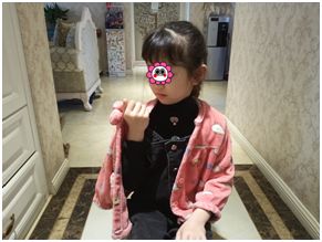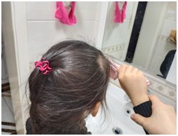 (3)梳頭訓(xùn)練:腦癱兒童在前方有鏡子的地方坐下,如果抓握困難,可以選擇加粗梳子把柄,家長演示梳頭發(fā)動(dòng)作使腦癱兒童模仿,或者輔助下讓腦癱兒童上肢舉過頭頂做來回環(huán)轉(zhuǎn)動(dòng)作梳理頭發(fā)(如圖3-5)。