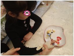 (2)進(jìn)食:進(jìn)食固體或半固體食物時(shí),家長輔助下將食物盛入合適的碗里放在桌上,對于抓握較差的腦癱兒童,可以用繃帶固定手抓握勺子,家長一手輔助腦癱兒童前臂旋前、旋后,一手環(huán)轉(zhuǎn)腕關(guān)節(jié)將食物舀起送入口中(如圖1-3、1-4),反復(fù)練習(xí),提高其進(jìn)食能力。對于能力稍好的腦癱兒童,可以選取簡單改裝的筷子,如兩根筷子頂部用橡皮筋各纏繞兩圈固定的方式夾取食物進(jìn)食(如圖1-5、1-6)。