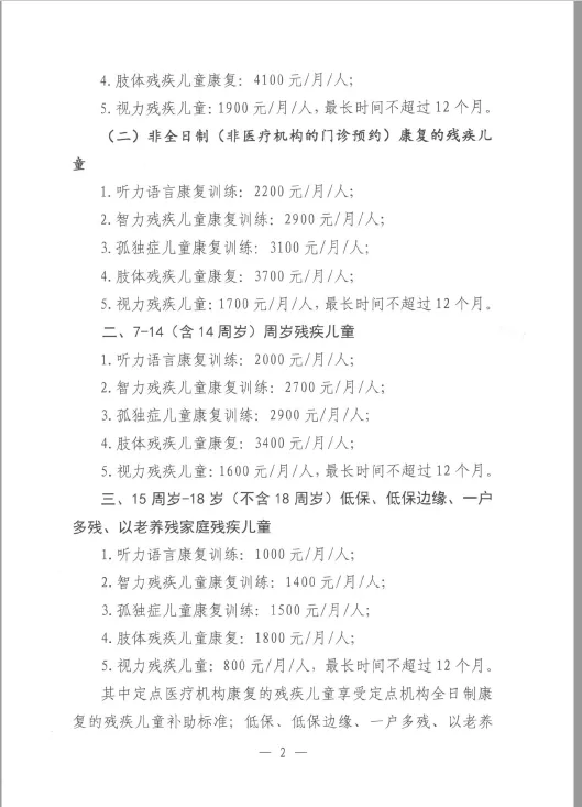 15周歲-18歲(不含18周歲)低保、低保邊緣、一戶多殘、以老養(yǎng)殘家庭聽力語言殘疾兒童康復(fù)訓(xùn)練每人每年可享最高1.2萬元的康復(fù)補(bǔ)助;智力殘疾兒童康復(fù)訓(xùn)練每人每年可享最高1.68萬元的康復(fù)補(bǔ)助;孤獨癥兒童康復(fù)訓(xùn)練每人每年可享最高1.8萬元的康復(fù)補(bǔ)助;肢體殘疾兒童康復(fù)訓(xùn)練每人每年可享最高2.16萬元的康復(fù)補(bǔ)助;視力殘疾兒童康復(fù)訓(xùn)練每人可享最高0.96萬元的康復(fù)補(bǔ)助。