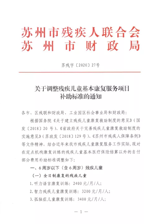 日前,蘇州市殘疾人聯(lián)合會、蘇州市財政局聯(lián)合下發(fā)《關(guān)于調(diào)整殘疾兒童基本康復(fù)服務(wù)項目補(bǔ)助標(biāo)準(zhǔn)的通知》。根據(jù)該通知,從2020年7月1日起,蘇州市對在定點機(jī)構(gòu)康復(fù)訓(xùn)練的殘疾兒童基本醫(yī)療保險結(jié)算以外的自付部分費(fèi)用補(bǔ)助標(biāo)準(zhǔn)進(jìn)行調(diào)整,殘疾兒童基本康復(fù)項目補(bǔ)助標(biāo)準(zhǔn)再提高,補(bǔ)助年齡也進(jìn)一步擴(kuò)大至18歲。